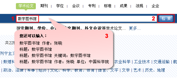 例如,“1”表示在所有字段里检索“数字图书馆”,那么结果全而多。